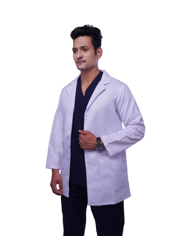 Doctor Coat 002 Fabric: Premium Cotton Blend Twill weave Design Features: Notch collar Short length Full sleeves Lower two stylised pockets Centre back slit at the bottom