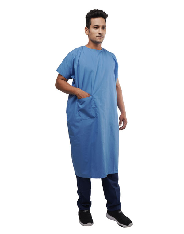 Unisex Patient Gown PG-001 Fabric: Polyester –Cotton (65:35) Plain Blue GSM -110 Design Features: Sky Blue gown with round neck String closure at the back Half sleeves One lower pocket