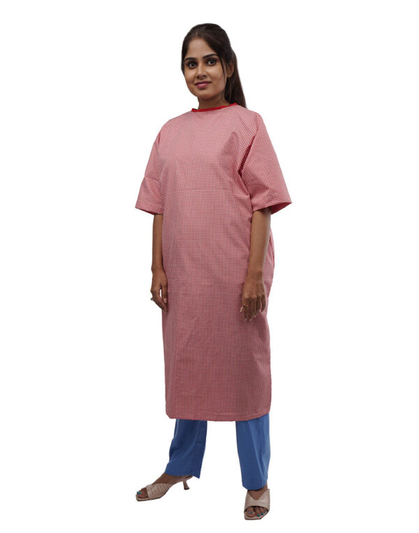 Unisex Patient Gown PG-002M Fabric: Polyester –Cotton (65:35) Micro Checks GSM -110 Design Features: Red and White micro checks gown with round neck Contrast Red piping around the neckline String closure at the back Half sleeves