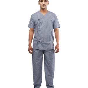 Unisex Patient Dress-PD-001 Fabric: Polyester –Cotton (65:35) Micro Checks GSM -110 Design Features: Blue and White micro checks tunic with V-neck Overlapping with drawstring to Tie Half sleeves Straight and comfort fit pants Pant with drawstring