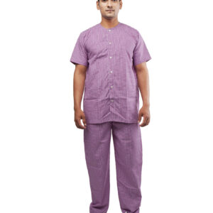 Unisex Patient Dress-PD-002 Fabric: Polyester –Cotton (65:35) Micro Checks GSM -110 Design Features: Purple and White micro checks tunic with round-neck Front open, button down closure Half sleeves Two lower pockets Straight and comfort fit pants Pant with drawstring