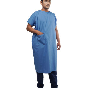 Unisex Patient Gown PG-001 Fabric: Polyester –Cotton (65:35) Plain Blue GSM -110 Design Features: Sky Blue gown with round neck String closure at the back Half sleeves One lower pocket