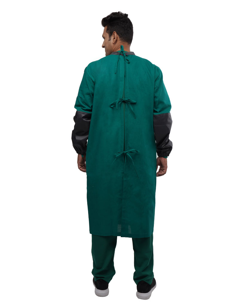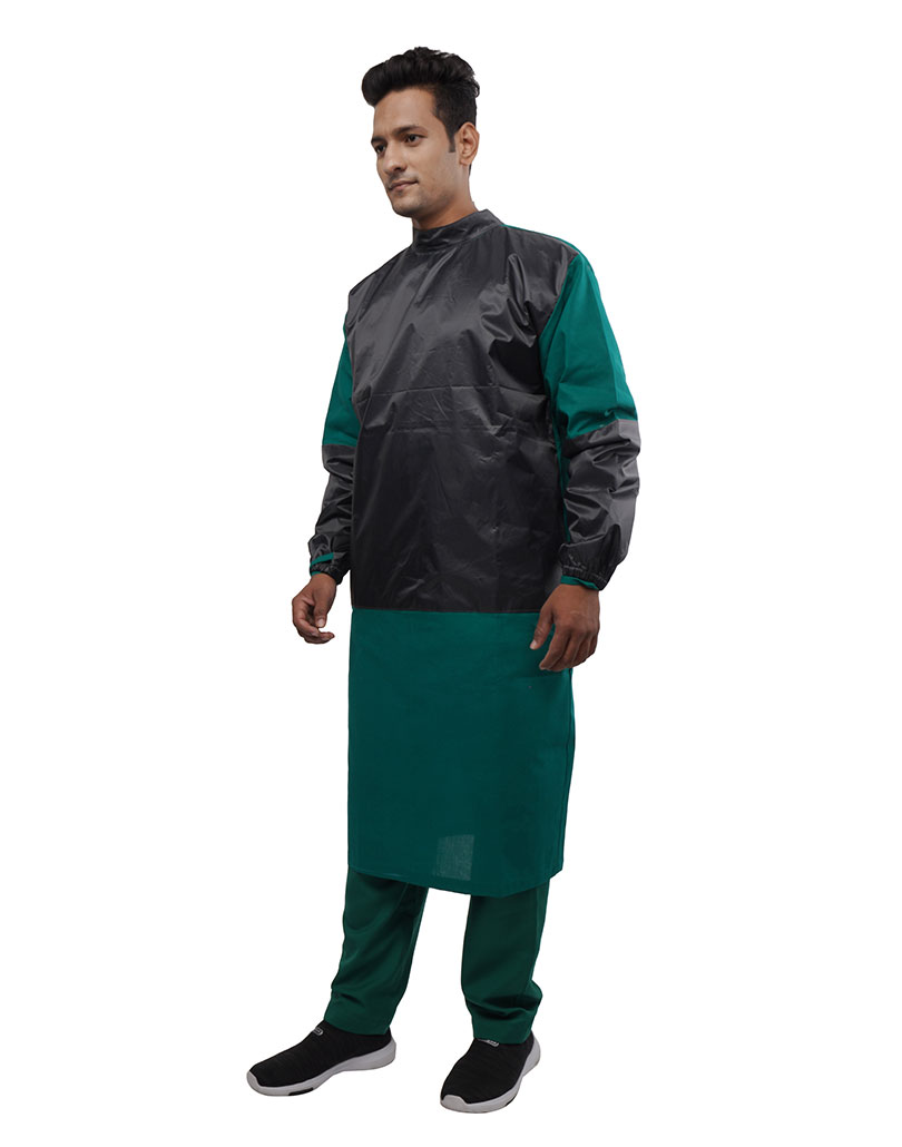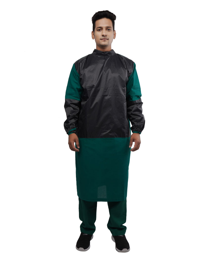 - Hospital Green Surgeon Gown with black PVC layer, includes cap and mask