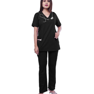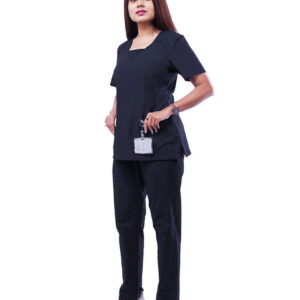 Women’s Scrub with flap on V-Neck –WS-007 Design Features: Classic V-Neck scrub top with flap Two lower pockets Side slit for ease of mobility Back two darts Straight leg pants Pants with two side pockets for essentials Drawstring with elastic closure on pants