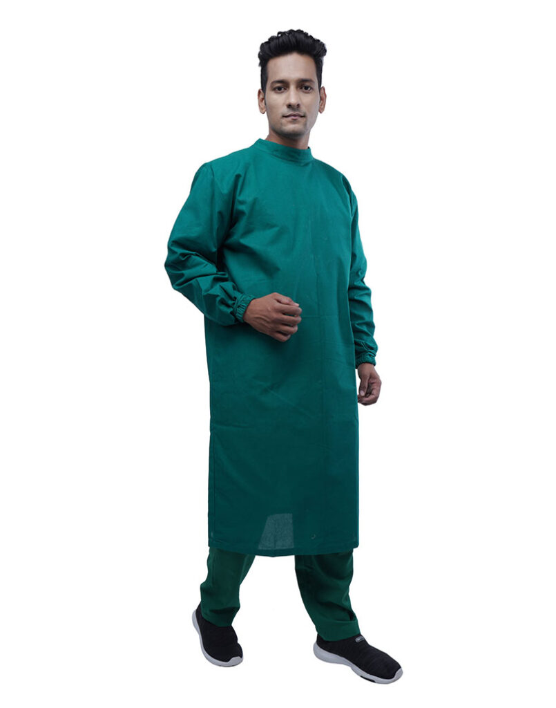 OT Gown -OTG-001 Fabric : 100% Cotton Casement Breathable Design Features: Hospital Green Surgeon Gown with Cap and Mask Reusable & Washable Autoclavable Comfortable Mandarin collar Elastic on the sleeve hem with string String closure at the back