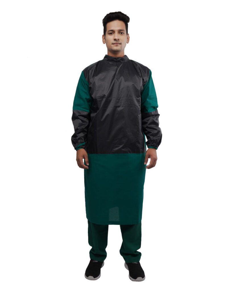 OT Gown -OTG-003 Fabric : 100% Cotton Casement Breathable Design Features: Hospital Green Surgeon Gown with black PVC layer, includes cap and mask Reusable & Washable Autoclavable Comfortable Mandarin collar PVC layer makes it water & fluid repellent Elastic on the sleeve hem with string String closure at the back