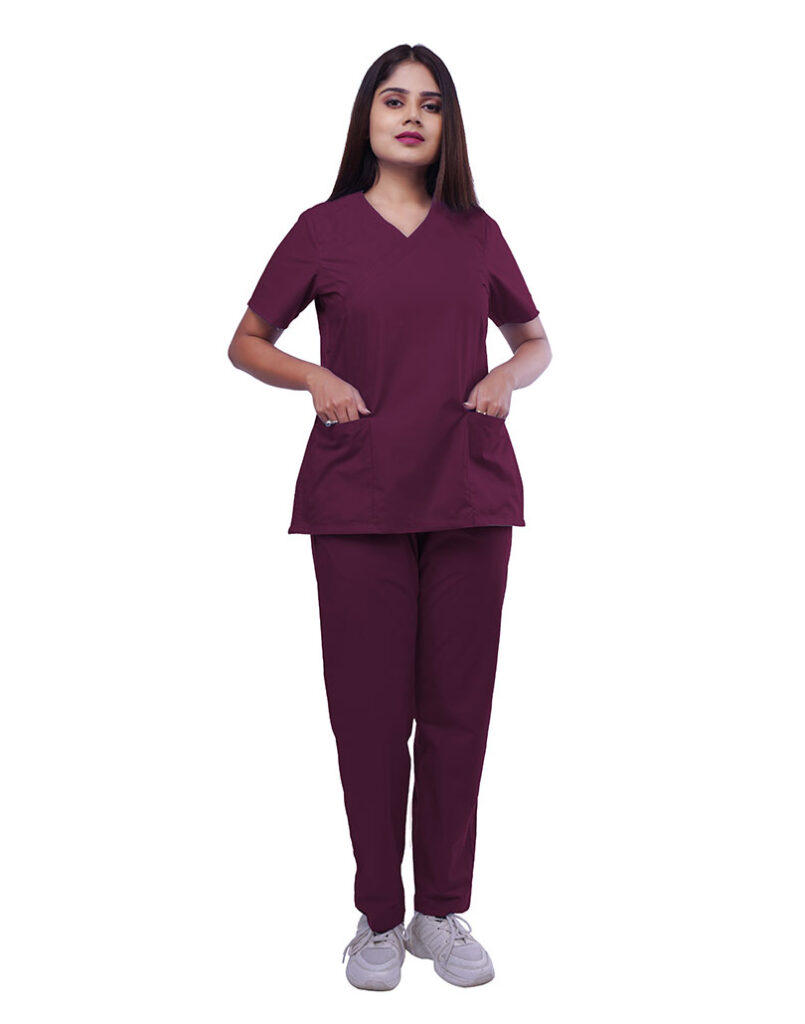 Women’s Wrap Style Scrub –WS-006 Design Features: V -Neck mock wrap scrub top Princess seam Two lower pockets Side slit for ease of mobility Back two darts Straight leg pants Pants with two side pockets for essentials Drawstring with elastic closure on pants